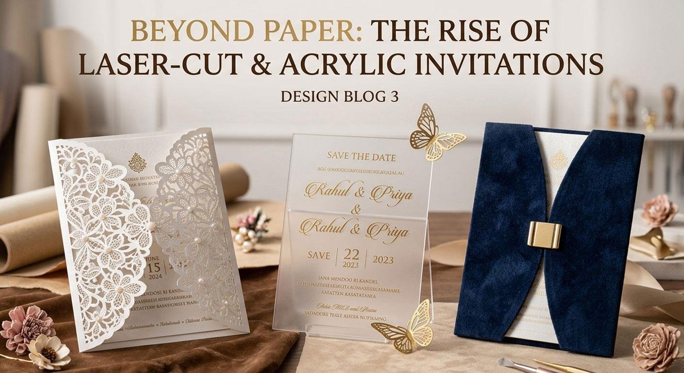 The Acrylic Edge: For the modern couple, clear or frosted acrylic cards with gold silk-screen printing provide a high-fashion, “editorial” look.