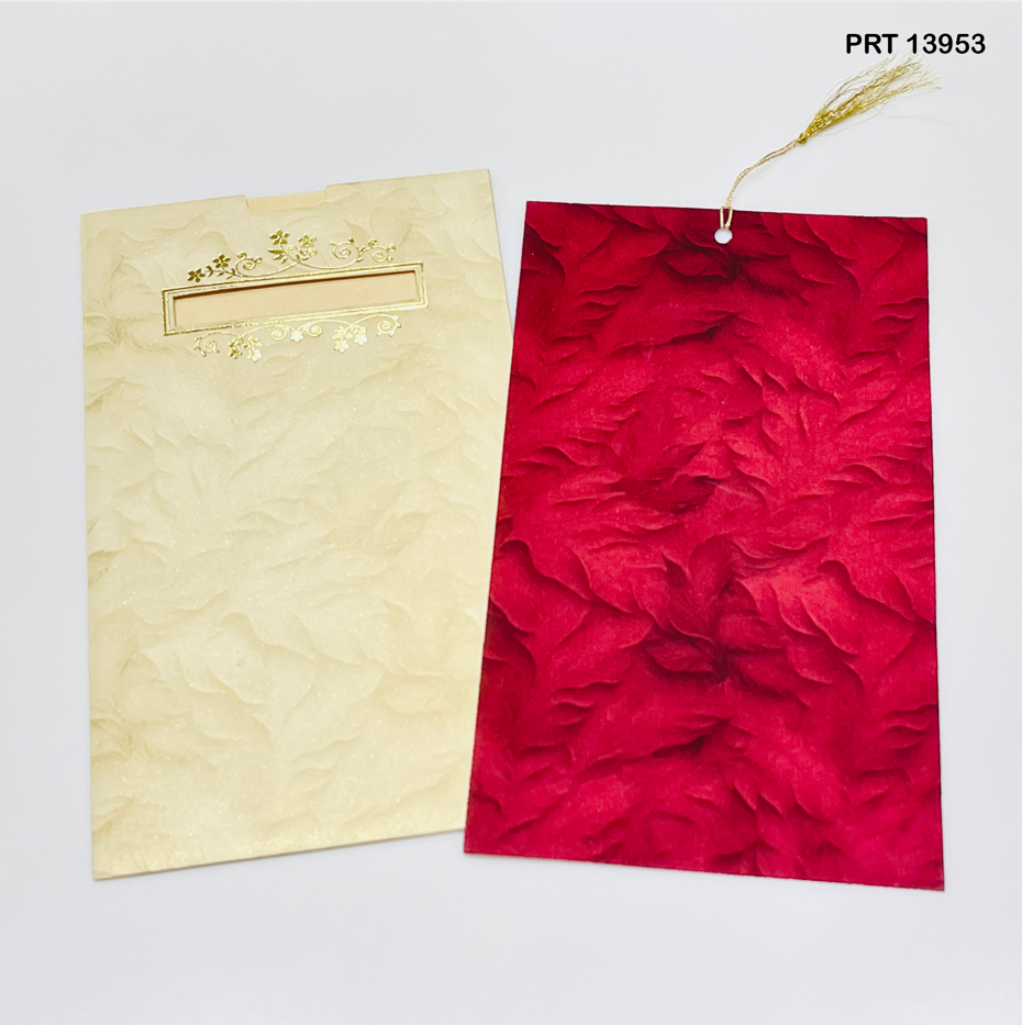 This luxurious crimson-red textured wedding card exudes grandeur with embossed floral detailing and a golden tassel accent. The ivory-toned insert adds balance and sophistication, making it a perfect invitation card for couples who wish to announce their wedding in style and regal elegance.
