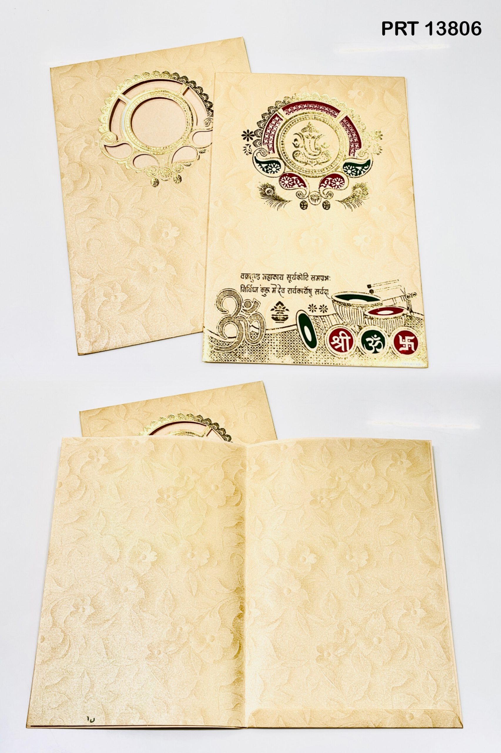 Radiating spiritual elegance, this wedding card features a rich beige base with embossed floral textures and intricate golden foil detailing. The centerpiece proudly displays a Lord Ganesha motif, surrounded by auspicious symbols like Om, Swastik, and Shree—bringing divine energy and blessings to the occasion. With traditional elements such as tablas and kalash, this card is perfect for a culturally rooted wedding that celebrates divine grace and festive spirit.