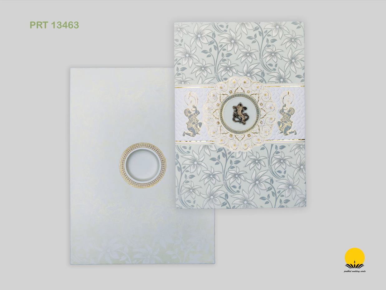 Gracefully blending tradition with modern design, our Divine Bloom Elegance invitation – PRT 13463 – is a serene expression of culture and style. The card features a soft floral pattern in shades of silver and ivory, beautifully enhanced by an embossed Ganesha motif at the center, encircled with intricate gold foil detailing. Two golden elephants on either side add an auspicious and festive touch, making it a true symbol of prosperity and joy.