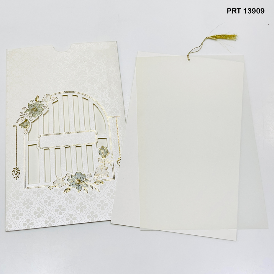 A symbol of new beginnings, this card features a beautifully embossed gate design with golden floral accents on a subtle patterned ivory base. The semi-arched gate motif adds a unique charm, signifying a warm welcome to your special day. Perfect for couples looking for a traditional yet artistic wedding invitation with an elegant touch of gold.
