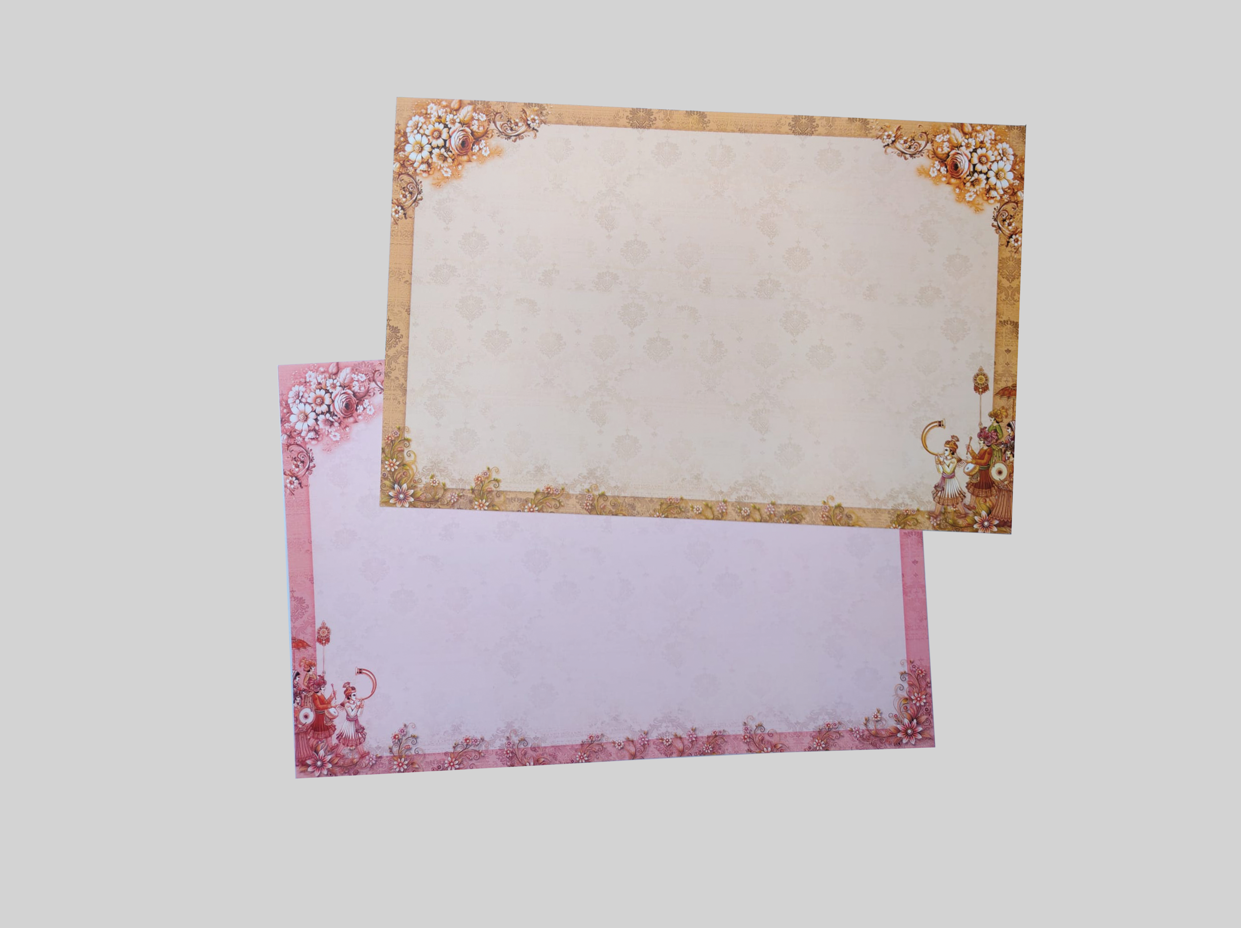This magnificent wedding invitation features a stunning depiction of a royal procession with intricate gold foil detailing, showcasing an elaborate display of regal figures, elephants, and musicians. The soft pastel shades of pink, peach, and lavender create an elegant background, while the central Ganesh symbol brings a divine touch to the design. The ornate floral borders add a delicate charm, making this invitation perfect for couples who wish to convey grandeur, tradition, and spirituality. Ideal for a lavish celebration, this invitation sets the tone for a truly royal wedding experience.