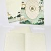 This serene and sophisticated wedding card is inspired by the elegance of royal Mughal gardens and palatial architecture. The front features a beautifully designed oval lattice window with intricate golden patterns, framing a traditional emblem in the center for a luxurious touch. Surrounding the centerpiece, lush greenery, domed pavilions, and ornate balconies evoke a tranquil palace courtyard scene in soft pastel tones. The accompanying envelope complements the theme with matching architectural motifs and muted foliage, enhancing the regal yet refreshing ambiance. Perfect for couples seeking a refined, heritage-rich wedding invite with a nature-inspired aesthetic.