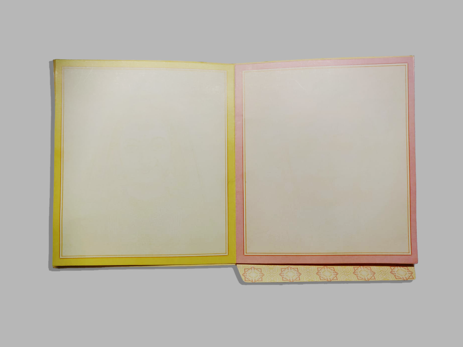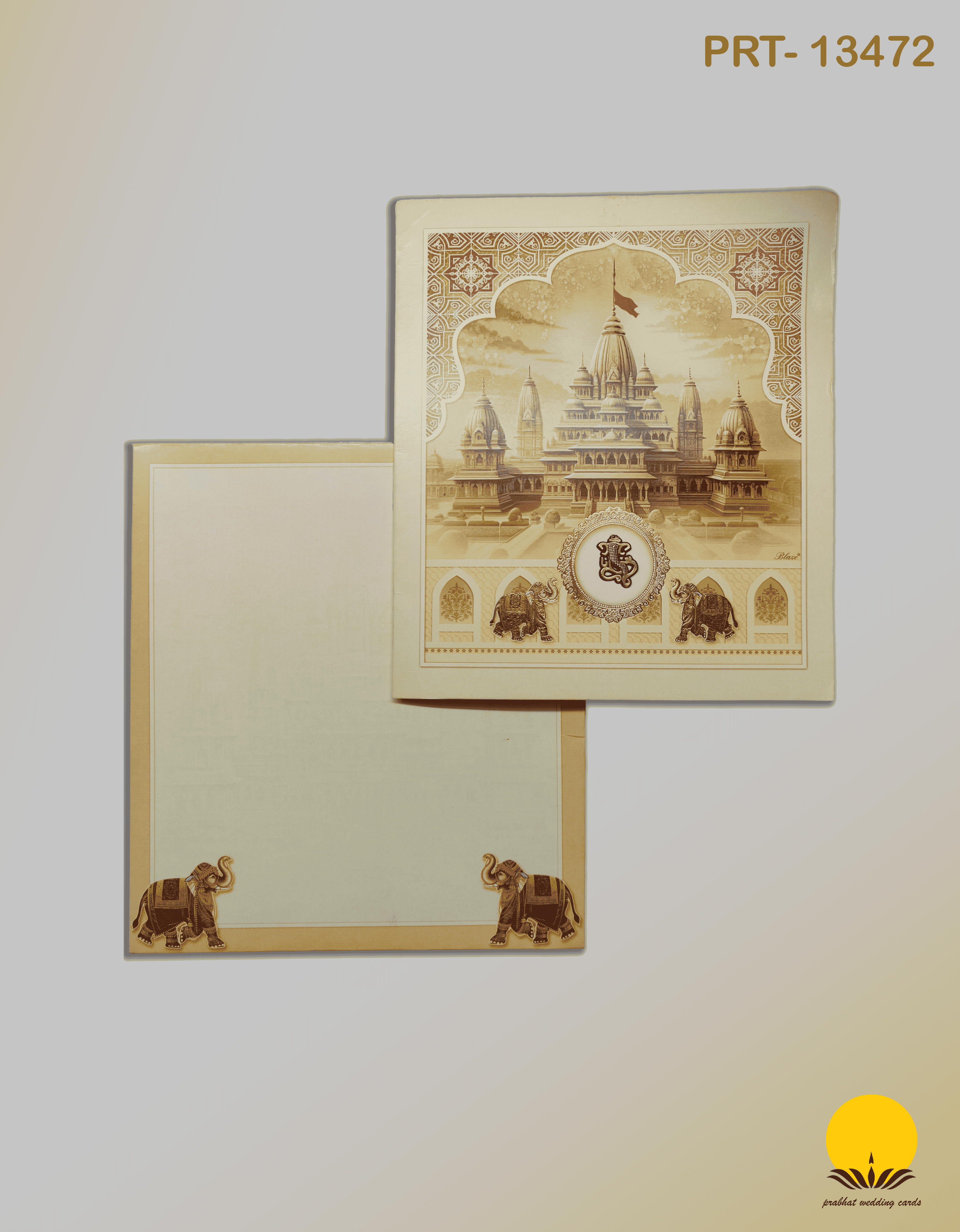 Celebrate your sacred union with this royal wedding card, featuring a majestic temple illustration that evokes divine blessings. Accentuated with traditional Indian motifs like intricately adorned elephants and rich golden borders, this card beautifully blends heritage with elegance. The front showcases a stunning temple artwork under a traditional arch, symbolizing purity and devotion. The insert carries subtle matching tones with classic elephant detailing, perfect for conveying your heartfelt wedding message.