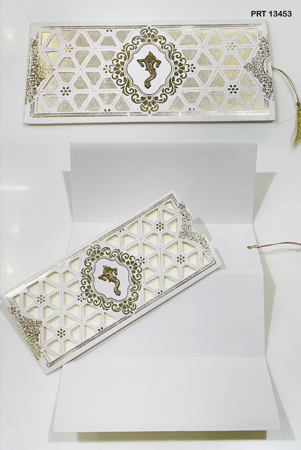 This elegant and timeless wedding invitation card, model PRT 13453, features a sleek rectangular design with a stunning laser-cut geometric pattern in gold and white. The centerpiece showcases a beautifully embossed golden Lord Ganesha motif, symbolizing blessings, wisdom, and new beginnings. Delicate gold foiling along the borders and corners enhances its luxurious appeal. A side tassel adds a traditional touch, while the insert slips seamlessly inside. Ideal for Hindu weddings, this card offers the perfect blend of divine charm and modern sophistication.